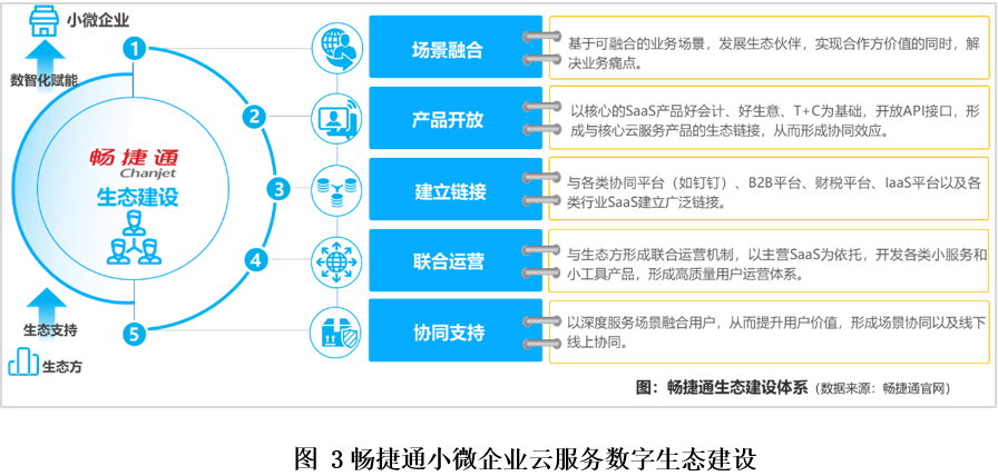 暢捷通致力于為中國(guó)小微企業(yè)提供以財(cái)務(wù)服務(wù)為中心的平臺(tái)服務(wù)、應(yīng)用服務(wù)、數(shù)據(jù)服務(wù)、金融服務(wù),通過全系列產(chǎn)品布局,滿足不同類型、不同發(fā)展階段、不同規(guī)模小微企業(yè)的云服務(wù)需求。暢捷通持續(xù)加對(duì)云服務(wù)業(yè)務(wù)的資源投入,持續(xù)推進(jìn)產(chǎn)品應(yīng)用創(chuàng)新,豐富和完善產(chǎn)品線,并以核心的SaaS產(chǎn)品為基礎(chǔ)開放API接口建立生態(tài)鏈接;外部生態(tài)上以多維度合作擴(kuò)展服務(wù)能力和價(jià)值,除傳統(tǒng)渠道合作合伙外,加強(qiáng)資源型渠道伙伴合作,入駐阿里、華為云等平臺(tái),打造多元生態(tài)渠道;通過生態(tài)的內(nèi)外協(xié)力作用,賦能內(nèi)部服務(wù)創(chuàng)新和產(chǎn)品創(chuàng)新,智能化服務(wù)嵌入提升運(yùn)營(yíng)能力和效率,深度融合業(yè)務(wù)場(chǎng)景服務(wù)用戶提升價(jià)值等,多維度的數(shù)字賦能推動(dòng)企業(yè)數(shù)字化成長(zhǎng),全方位的增值服務(wù)奠定差異化的優(yōu)勢(shì)。