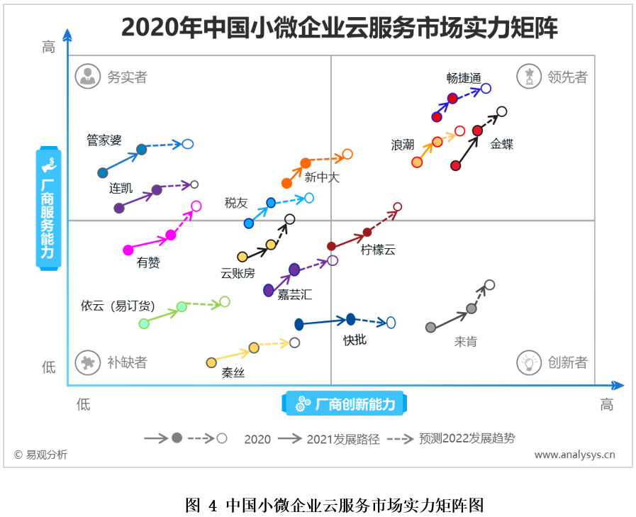 創(chuàng)新者在技術(shù)創(chuàng)新上投入,以數(shù)字化賦能深耕領(lǐng)域,并以獨(dú)特的經(jīng)營(yíng)模式,獲得核心競(jìng)爭(zhēng)力。創(chuàng)新者代表有檸檬云、來肯等。其中,檸檬云以永久免費(fèi)的財(cái)務(wù)軟件、進(jìn)銷存SaaS和專業(yè)代賬軟件作為運(yùn)營(yíng)策略,吸引弱財(cái)力的小微企業(yè),從拓業(yè)、獲客、提效三大方面賦能,助力小微企業(yè)數(shù)字化升級(jí),實(shí)現(xiàn)財(cái)務(wù)工作高效、高質(zhì)量并降低企業(yè)經(jīng)營(yíng)成本,檸檬云也以其獨(dú)特的經(jīng)營(yíng)模式領(lǐng)跑財(cái)務(wù)SaaS領(lǐng)域。來肯聚焦商貿(mào)領(lǐng)域,自2015年上線來肯云商,持續(xù)創(chuàng)新不斷迭代升級(jí)產(chǎn)品,在進(jìn)銷存基礎(chǔ)上加載數(shù)字營(yíng)銷、全流程移動(dòng)化、支持供應(yīng)鏈互通等構(gòu)成產(chǎn)品核心競(jìng)爭(zhēng)優(yōu)勢(shì)。