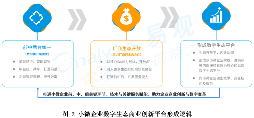 易觀分析認(rèn)為,未來小微企業(yè)數(shù)字化、智能化轉(zhuǎn)型要求小微企業(yè)的需求不再是割裂、單方向的,而是一體化、多方向的,云服務(wù)不僅要解決小微企業(yè)后端的財稅管理、風(fēng)險管理等問題,也需要解決前端營銷、客戶在線等問題,同時還需要能夠?qū)崿F(xiàn)前、中、后、線上、線下等多維度數(shù)據(jù)、資源、管理的順暢銜接。