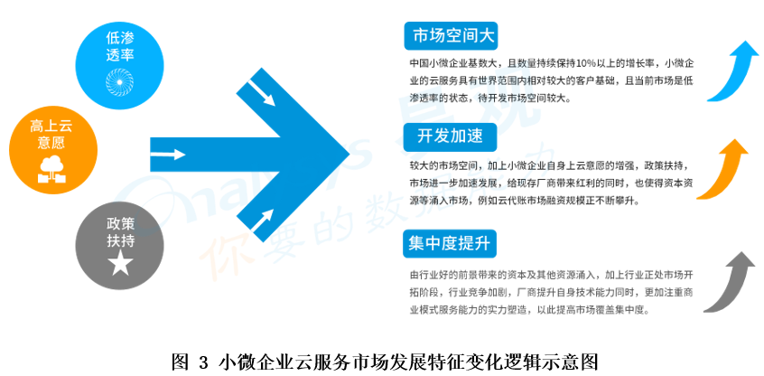 綜合以上,中國小微企業(yè)云服務(wù)市場具有低滲透率、政策扶持力度高、小微企業(yè)上云意識逐漸加強(qiáng)且上云意愿強(qiáng)烈的特征,加之市場上頭部服務(wù)商正在探索從產(chǎn)品服務(wù)模式向平臺服務(wù)模式的轉(zhuǎn)變,市場將迎來一些特征上的發(fā)展變化。現(xiàn)狀上,中國小微企業(yè)基數(shù)大,且數(shù)量持續(xù)保持10%以上的增長率,小微企業(yè)的云服務(wù)具有世界范圍內(nèi)相對較大的客戶基礎(chǔ),而當(dāng)前市場是低滲透率的狀態(tài),待開發(fā)市場空間較大。較大的待開發(fā)市場空間,加上小微企業(yè)自身上云意愿的增強(qiáng),政策扶持力度不斷加大,市場進(jìn)一步加速發(fā)展,給現(xiàn)存廠商帶來紅利的同時,也使得資本、資源等涌入市場,例如云代賬市場融資規(guī)模正不斷攀升。由行業(yè)好的前景帶來的資本及其他資源涌入,加上行業(yè)正處市場拓荒階段,行業(yè)競爭加劇,廠商提升自身技術(shù)能力同時,更加注重商業(yè)模式服務(wù)能力的實力塑造,以此提高市場覆蓋集中度。從而帶動整個小微企業(yè)云服務(wù)產(chǎn)業(yè)鏈產(chǎn)生同頻共振式增長狀態(tài)。