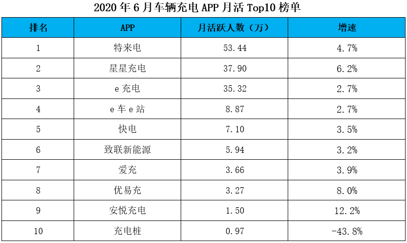 在2020年6月車(chē)輛充電APP月活Top10榜單中,特來(lái)電以53.44萬(wàn)月活位居榜首,居于第二名的星星充電月活為37.9萬(wàn),第三名e充電(國(guó)家電網(wǎng)旗下平臺(tái))月活為45.32萬(wàn)。增速方面,本月Top10廠商,除了“充電樁”APP之外的廠商其取得了增長(zhǎng),其中上汽旗下的安悅充電月活增長(zhǎng)12.2%,增速位居本月第一。
