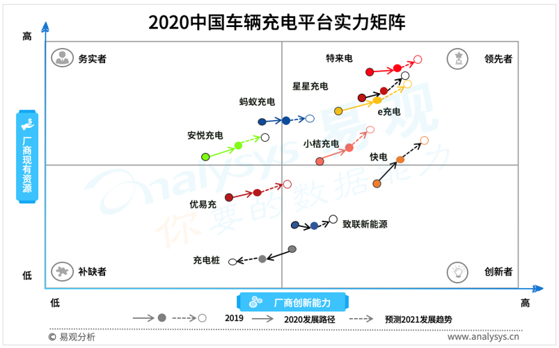 本次,我們將汽車(chē)充電平臺(tái)競(jìng)爭(zhēng)力拆分為資源能力、創(chuàng)新能力兩個(gè)大的維度和8個(gè)細(xì)分維度,通過(guò)調(diào)研和易觀千帆大數(shù)據(jù)分析得出了“2020中國(guó)車(chē)輛充電平臺(tái)實(shí)力矩陣”。由下圖可以看出,中國(guó)充電平臺(tái)目前呈現(xiàn)特來(lái)電、星星充電、e充電三強(qiáng)領(lǐng)先的格局,另外,能鏈集團(tuán)的快電、滴滴旗下的小桔充電和螞蟻金服旗下的螞蟻充電依據(jù)自身資源和創(chuàng)新模式展現(xiàn)出較強(qiáng)進(jìn)取力。