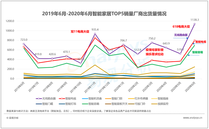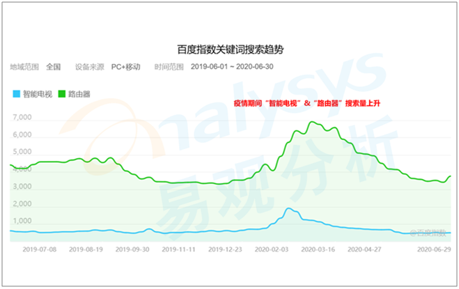 從時間上看,受到618和雙11電商大促拉動,智能家居的普遍銷量高峰出現(xiàn)在6月和11月,但是除此之外,還有兩個較小的銷量高峰在1月和3月,3月的銷量可能很可能是受到疫情影響,尤其是路由器和智能電視,這也和這兩個品類的百度搜過指數(shù)一致。疫情期間的2月和3月,消費者居家隔離,家中多人通過WiFi連接網(wǎng)絡,遠程辦公、在線教育視頻、游戲等對網(wǎng)速及穩(wěn)定性要求高,對路由器升級換代的需求迫切,另外長期居家隔離,影音娛樂需求主要靠電視滿足,因此智能電視的銷量也在3月出現(xiàn)了一個高峰。