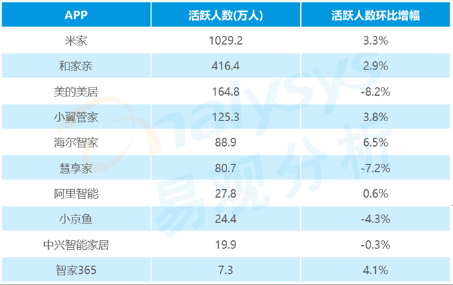 小米一馬當先。智能中控應用平臺玩家有智能家電設備廠商如小米、美的、海爾,電信運營商如中移動和中國電信,云廠商和電商平臺如阿里和京東等。易觀千帆數(shù)據(jù)顯示,2020年7月,小米的米家APP活躍人數(shù)仍然保持領先地位,7月活躍人數(shù)為1029.2萬人,環(huán)比活躍增幅為3.3%。月活人數(shù)排在第二位的是中移動的和家親APP,月活人數(shù)為416.4萬人。