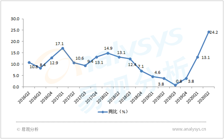 2016-2020年各季度全國網(wǎng)絡(luò)零售滲透指數(shù)同比走勢圖