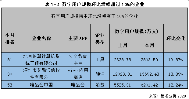 9月企業(yè)數(shù)字用戶規(guī)模變化仍集中在10%以內(nèi),占比達(dá)87%;其中,增幅10%以內(nèi)企業(yè)數(shù)占55%,跌幅在10%以內(nèi)占32%,增幅超過10%的有3家企業(yè),分別是工具領(lǐng)域的北京盈算計(jì)算機(jī)系統(tǒng)工程有限公司、硬件領(lǐng)域的深圳市艾酷通信軟件有限公司和消費(fèi)領(lǐng)域的唯品會(huì)。