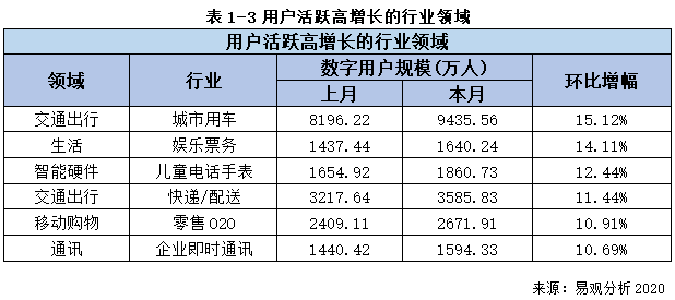 據(jù)國(guó)家統(tǒng)計(jì)局?jǐn)?shù)據(jù)顯示,9月社會(huì)銷售品零售總額增長(zhǎng)3.3%,疫情后持續(xù)第二月正增長(zhǎng),說明國(guó)內(nèi)消費(fèi)市場(chǎng)穩(wěn)定復(fù)蘇、持續(xù)向好,交通出行、生活服務(wù)、移動(dòng)購(gòu)物領(lǐng)域用戶需求增長(zhǎng)。易觀千帆數(shù)據(jù)顯示,這些需求帶動(dòng)了城市用車、娛樂票務(wù)、零售O2O、快遞/配送等行業(yè)領(lǐng)域數(shù)字用戶活躍規(guī)模實(shí)現(xiàn)超過10%的環(huán)比增長(zhǎng)。