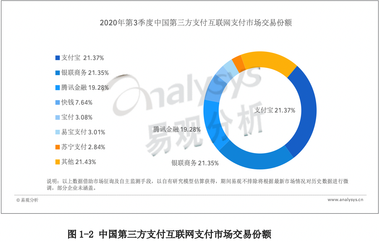2020年第3季度,第三方互聯(lián)網(wǎng)支付市場仍然延續(xù)上季度的競爭格局,支付寶以21.37%的市場占有率繼續(xù)保持第一名,緊隨其后的是銀聯(lián)支付,市場占有率為21.35%;騰訊金融以19.28%的市場占有率位列第三。