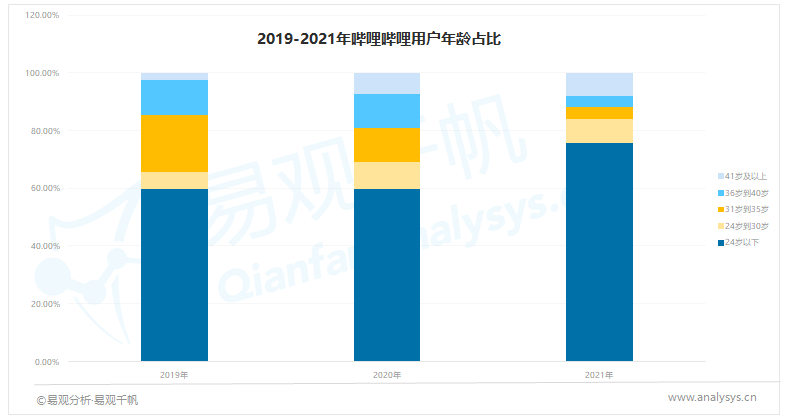 2020年5月,兩分鐘的《后浪》視頻迅速走紅,堪稱是B站的破圈之作。不僅輿論蜂擁而至,也掀起了社會(huì)對于“后浪”一詞的廣泛討論。根據(jù)易觀千帆新指標(biāo)中的次月留存率,可以看到5月的留存率也成了B站的全年最高點(diǎn)。B站本身也確實(shí)是“后浪”們的聚集地,不過,這段演講視頻之所以出圈,還是因?yàn)樗鼮锽站吸引了眾多“前浪”用戶群體。根據(jù)易觀千帆的用戶屬性分析,目前B站24歲以下的年輕用戶占75.84%,這一數(shù)字遠(yuǎn)高于其他平臺。35歲以下用戶數(shù)占比88.36%,相比于上一年的80.8%有一定的增長。根據(jù)B站聆訊后資料集,B站核心用戶逐步從Z世代群體拓展至Z+世代人群(1985-2009年出生人群)。互聯(lián)網(wǎng)原住民一直是B站的有力后盾,而隨著新用戶群的進(jìn)一步拓展,新老用戶帶來的多元文化融合共生及其對原有社區(qū)改造,將是未來一定時(shí)間內(nèi)的看點(diǎn)。