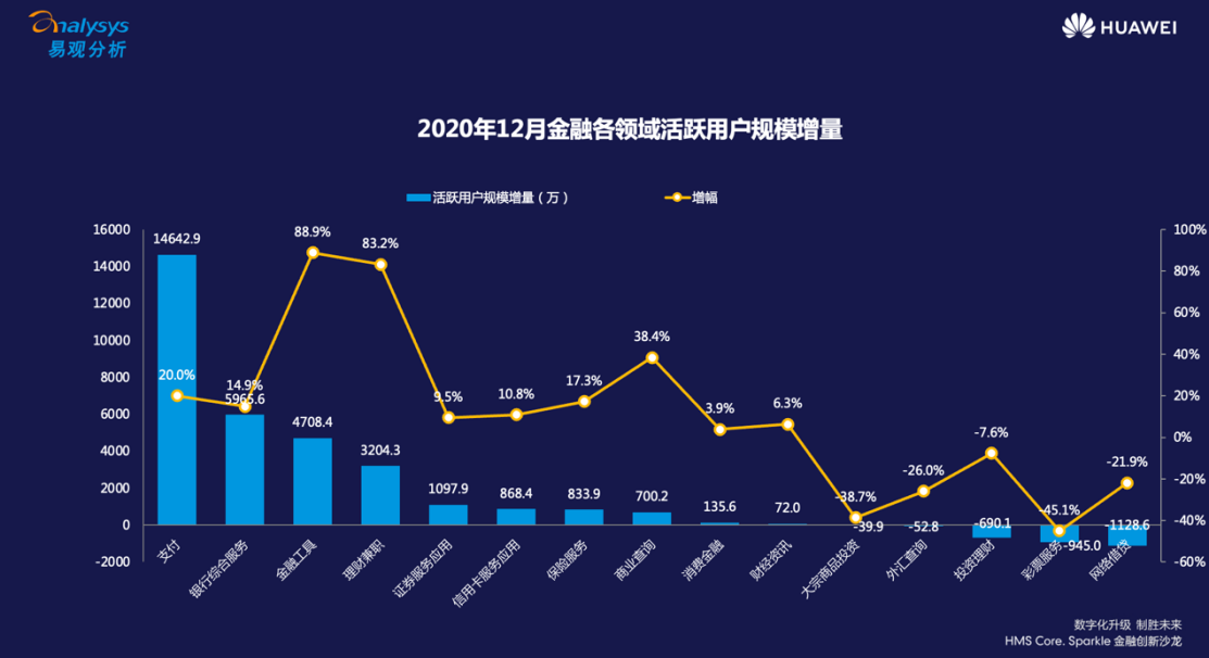 金融類APP的用戶規(guī)模增長是一個持續(xù)的趨勢,所以即使在以后沒有疫情,2021、2022年活躍度還是會持續(xù)增長。但是,這并不代表所有金融行業(yè)用戶規(guī)模都會增長,從具體行業(yè)細(xì)分來看,根據(jù)易觀分析統(tǒng)計,支付類應(yīng)用和銀行類應(yīng)用、金融工具類和證券類應(yīng)用的活躍度增長規(guī)模是最多的,相對來說大宗商品投資和網(wǎng)絡(luò)接待服務(wù)的活躍度規(guī)模卻在大幅度降低,每個金融細(xì)分行業(yè)都有各自的特征。