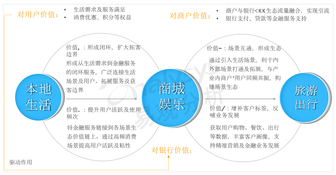 易觀分析認(rèn)為,相關(guān)動(dòng)作比較契合信用卡未來(lái)發(fā)展的大零售戰(zhàn)略,信用卡APP場(chǎng)景化經(jīng)營(yíng),有利于銀行拓展服務(wù)及獲客邊界、構(gòu)建場(chǎng)景生態(tài)、提升用戶活躍及使用頻次、豐富客戶畫像反哺金融業(yè)務(wù)發(fā)展,對(duì)用戶、商戶、銀行能夠產(chǎn)生多重價(jià)值。
