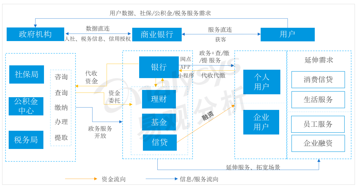 易觀分析認(rèn)為,商業(yè)銀行未來(lái)通過(guò)加大與政府機(jī)構(gòu)合作,能夠快速覆蓋各地企業(yè)和居民更多元需求,以便民政務(wù)服務(wù)為抓手有利于帶動(dòng)金融服務(wù)滲透,如個(gè)人信貸服務(wù)、基于養(yǎng)老和公積金場(chǎng)景定制理財(cái)服務(wù)等。另外在產(chǎn)業(yè)互聯(lián)網(wǎng)發(fā)展大背景下,銀行基于APP連接C端的政務(wù)服務(wù),向企業(yè)端賦能,延伸到企業(yè)員工服務(wù)如黨務(wù)、工會(huì)的代繳黨費(fèi)、代發(fā)福利等服務(wù)場(chǎng)景,同樣存在用戶發(fā)展機(jī)遇。