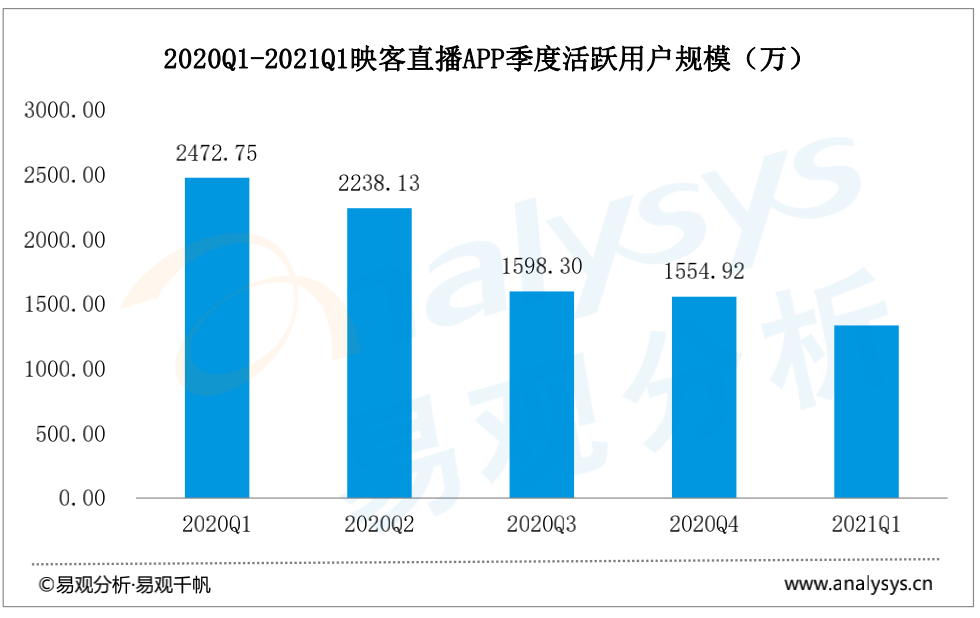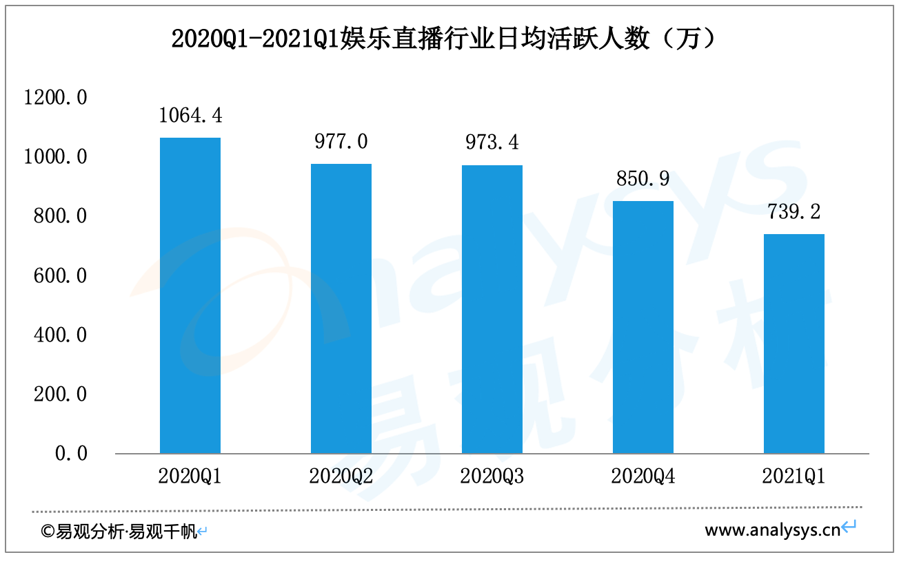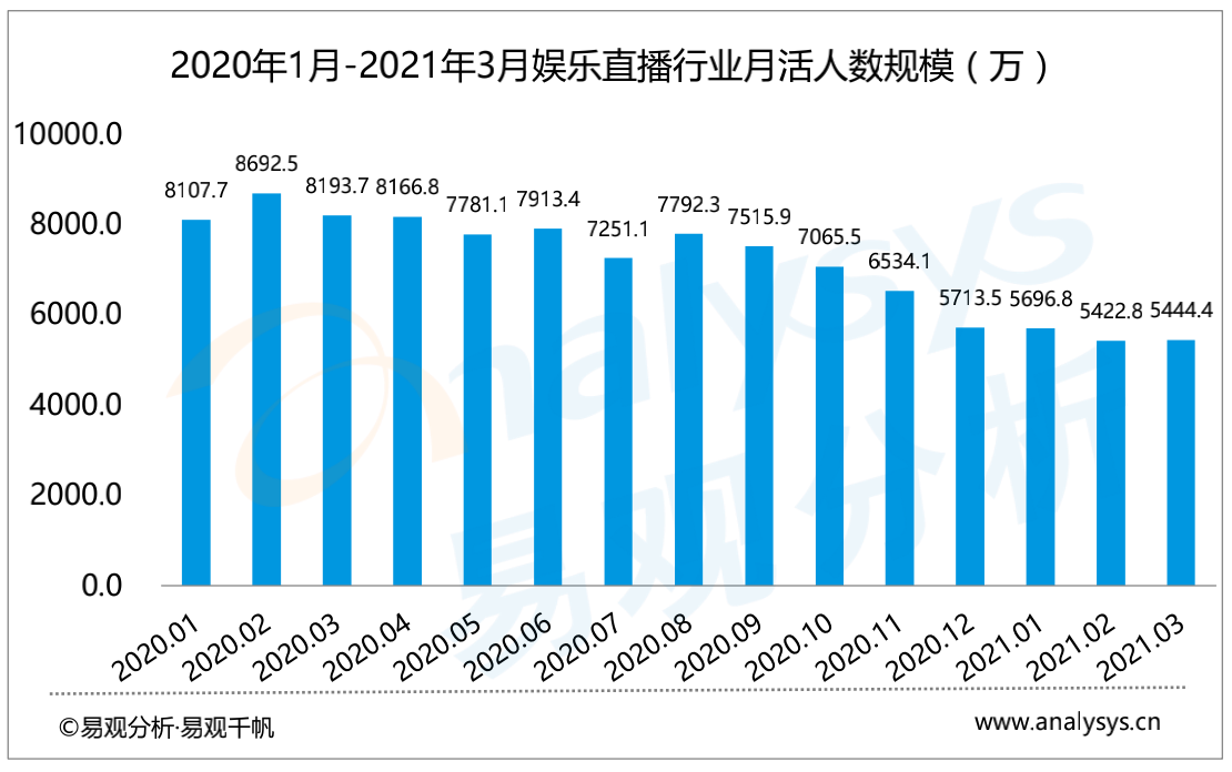 易觀千帆數(shù)據(jù)顯示,2021年第1季度,娛樂直播行業(yè)日均活躍人數(shù)達(dá)739.2萬,相較2020年第4季度下降13.1%。在季度內(nèi)活躍用戶規(guī)模也稍有下降,1、2、3月的月活規(guī)模分別達(dá)到5696.8萬,5422.8萬、5444.4萬。