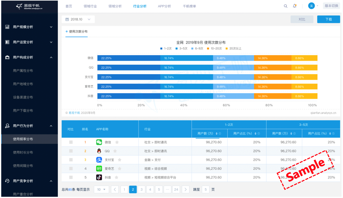 易觀千帆為了幫助企業(yè)提高產(chǎn)品用戶生命周期價(jià)值,新增使用頻率區(qū)間、使用頻率分布占比、使用頻率分布用戶數(shù)、使用間隔等用戶行為相關(guān)指標(biāo)。首先,企業(yè)可以通過用戶使用頻率區(qū)間對用戶分層;其次,可以通過用戶使用頻率分布、使用時(shí)長區(qū)間分布等指標(biāo)進(jìn)行與之對應(yīng)的產(chǎn)品推送。例如:某金融保險(xiǎn)APP大部分用戶單日使用頻率區(qū)間在1-2次,使用時(shí)間一般在12點(diǎn)-13點(diǎn)和20點(diǎn)-21點(diǎn),使用時(shí)長一般在10-30分鐘,那么該APP就可以執(zhí)行精準(zhǔn)營銷策略,在用戶使用APP高峰時(shí)段為這類用戶推送10-30分鐘內(nèi)能充分了解完產(chǎn)品詳情的高價(jià)值產(chǎn)品,從而引導(dǎo)用戶下單,提高用戶轉(zhuǎn)化價(jià)值。使用頻率區(qū)間:使用頻率為單日啟動(dòng)次數(shù),并分成區(qū)間1-2次、3-5次、6-9次、10-19次、20次以上。使用頻率分布占比:在統(tǒng)計(jì)周期(周/月)內(nèi),該App每日各使用頻率區(qū)間用戶數(shù)占比的平均值。使用頻率分布用戶數(shù):在統(tǒng)計(jì)周期(周/月)內(nèi),該App每日各使用頻率區(qū)間用戶數(shù)的平均值。使用時(shí)長區(qū)間:使用時(shí)長為單日使用時(shí)長,并分成區(qū)間0-3秒、4-9秒、10-29秒、30-59秒、1-3分鐘、3-10分鐘、10-30分鐘、30分鐘以上。易觀千帆致力于移動(dòng)互聯(lián)網(wǎng)產(chǎn)品分析,為企業(yè)評估渠道價(jià)值、營銷活動(dòng)獲客力度及轉(zhuǎn)化效果提供精準(zhǔn)的數(shù)據(jù)支持,幫助企業(yè)在運(yùn)營中精細(xì)掌握每一個(gè)環(huán)節(jié),延長用戶生命周期,提高用戶生命周期價(jià)值。