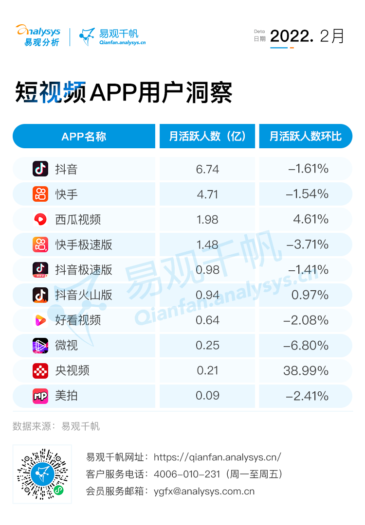 短視頻行業(yè)中,西瓜視頻、抖音火山版、央視頻活躍用戶人數(shù)相比1月有一定增長(zhǎng),其中央視頻作為北京冬奧會(huì)的官方直播短視頻平臺(tái)在2月獲得了明顯的活躍用戶增長(zhǎng),環(huán)比高達(dá)38.99%。2月短視頻平臺(tái)有以下動(dòng)態(tài)值得關(guān)注: