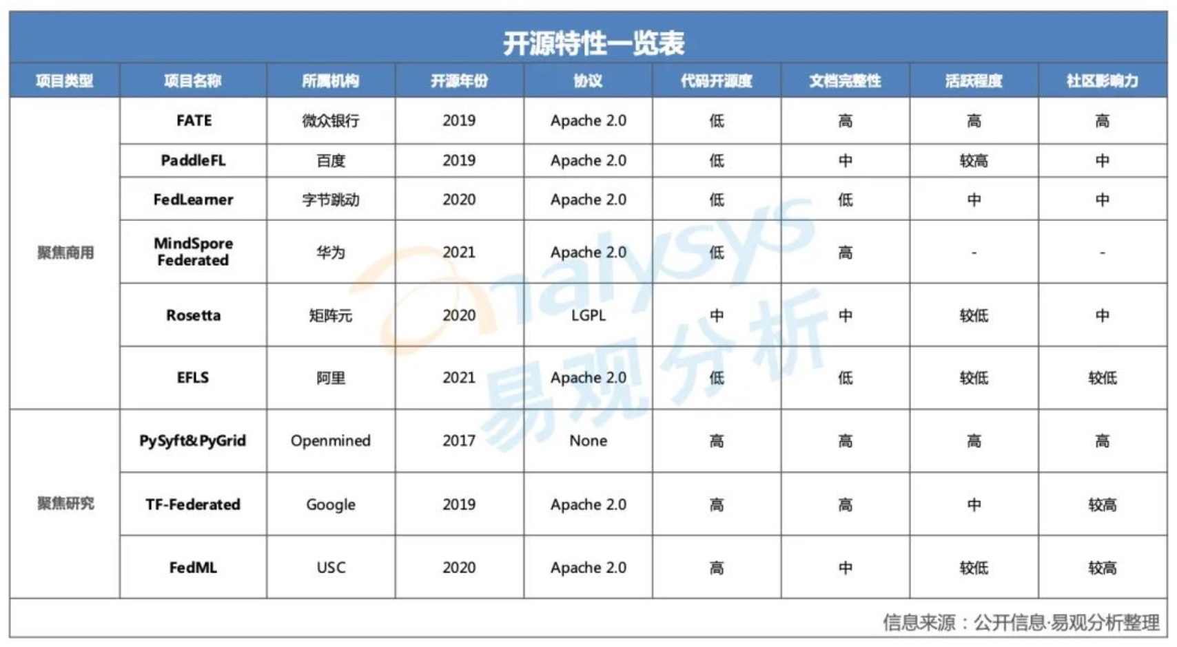 聯(lián)邦學(xué)習(xí)開(kāi)源項(xiàng)目整體發(fā)展良好,但項(xiàng)目之間存在較為明顯的差異性。協(xié)議方面,除PySyft & PyGrid外均采用對(duì)商業(yè)化影響較小的協(xié)議。代碼開(kāi)源度方面,PySyft&PyGrid、TF-Federated和FedML等研究型開(kāi)源項(xiàng)目相對(duì)較高,能夠?qū)Φ讓铀阕印⑺惴ê桶踩珔f(xié)議等代碼實(shí)現(xiàn)開(kāi)源開(kāi)放。FATE、MindSpore Federated、TF-Federated、PySyft&PyGrid等文檔完整性較高的項(xiàng)目普遍活躍程度也較高。表1:聯(lián)邦學(xué)習(xí)開(kāi)源項(xiàng)目之開(kāi)源特性對(duì)比