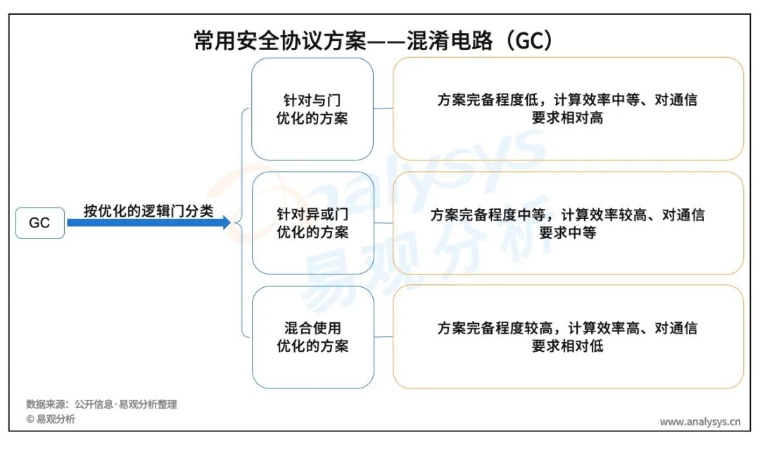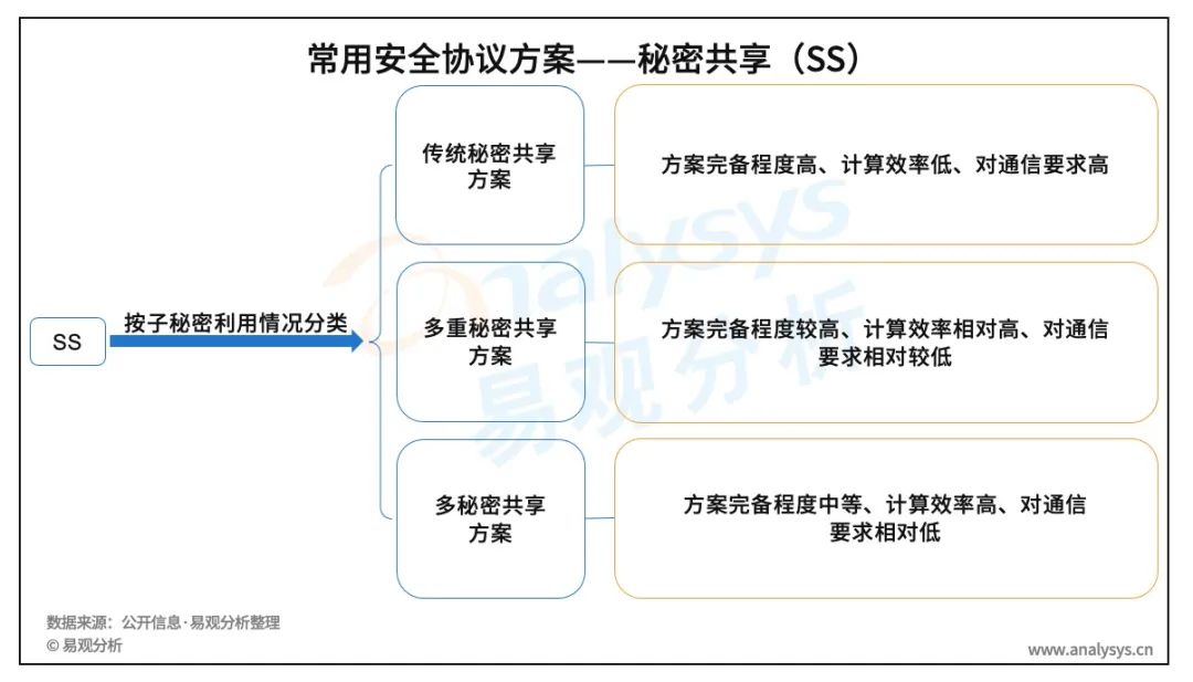易觀數(shù)字化:在多方安全計(jì)算的實(shí)際應(yīng)用中,根據(jù)分布式多方安全計(jì)算對(duì)性能的要求,會(huì)選擇不同的常用安全協(xié)議方案。多方安全計(jì)算常用安全協(xié)議方案在實(shí)現(xiàn)難度和性能表現(xiàn)方面都存在很大差異,易觀分析建議技術(shù)使用方在分布式多方安全計(jì)算的實(shí)際應(yīng)用中應(yīng)關(guān)注自身現(xiàn)有和未來規(guī)劃的計(jì)算與通信能力,結(jié)合常用安全協(xié)議方案的完備程度,選擇合適的安全協(xié)議方案。