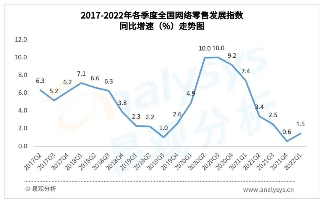 近日,中國國際電子商務(wù)中心與易觀分析聯(lián)合發(fā)布了2022年1季度“全國網(wǎng)絡(luò)零售發(fā)展指數(shù)”及其分指數(shù)。2022年1季度全國網(wǎng)絡(luò)零售發(fā)展指數(shù)同比增長1.5%,增速比上季度加快0.9個(gè)百分點(diǎn),環(huán)比下降3.6%。本季度,在“2022全國網(wǎng)上年貨節(jié)”、“情人節(jié)”、“三八節(jié)”等促銷活動(dòng)推動(dòng),及元旦春節(jié)等假日因素帶動(dòng)下,網(wǎng)絡(luò)零售市場持續(xù)增長。