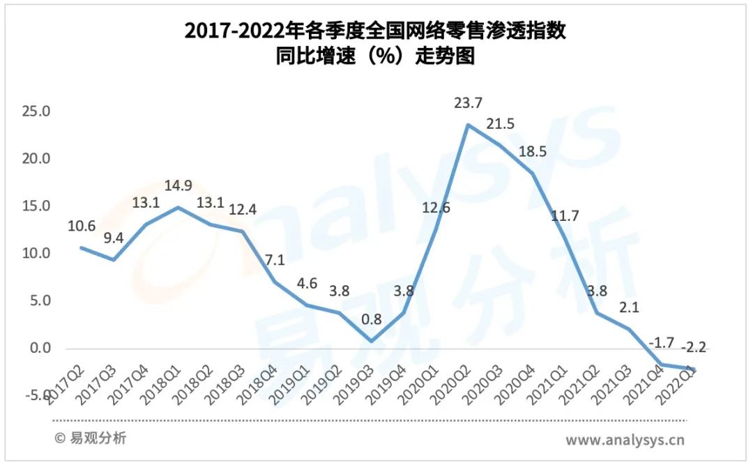 二、網(wǎng)絡(luò)零售市場滲透持續(xù)下降。2022年1季度全國網(wǎng)絡(luò)零售滲透指數(shù)同比下降2.2%,環(huán)比下降9.4%。受監(jiān)管趨嚴(yán)、資本退潮、多地疫情波及等因素影響,部分電商面臨資金以及營收的雙重壓力。易觀分析數(shù)據(jù)顯示,本季度,網(wǎng)絡(luò)零售法人企業(yè)資產(chǎn)總額同比下降22.9%,環(huán)比下降7.3%。社區(qū)團(tuán)購、生鮮電商等新業(yè)態(tài)出現(xiàn)業(yè)務(wù)清退收縮與盈利模型優(yōu)化并存的情況。本季度,在供應(yīng)鏈成本高企、低價(jià)補(bǔ)貼無以為繼、監(jiān)管趨嚴(yán)等因素的持續(xù)影響下,橙心優(yōu)選、十薈團(tuán)等社區(qū)團(tuán)購平臺(tái)關(guān)停,京喜拼拼、美團(tuán)優(yōu)選、多多買菜、淘菜菜等也進(jìn)行戰(zhàn)線收縮和人員優(yōu)化。于此同時(shí),在冷鏈物流配送能力增強(qiáng)、疫情激發(fā)外賣需求增長以及新時(shí)代消費(fèi)者便利化消費(fèi)習(xí)慣推動(dòng)背景下,預(yù)制菜成為生鮮電商新的突破口。平臺(tái)數(shù)據(jù)顯示,春節(jié)期間,每日優(yōu)鮮預(yù)制菜品銷售額較平日增長2.7倍,盒馬預(yù)制菜銷量同比增長超3倍。