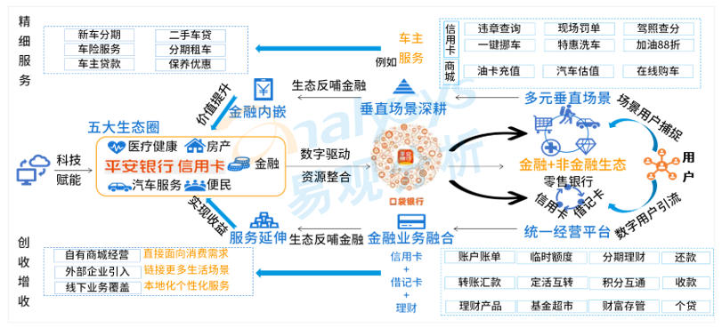 平安銀行綜合化經(jīng)營(yíng)優(yōu)勢(shì)突出,科技驅(qū)動(dòng)“五位一體”零售金融模式。平安銀行積極打造AI銀行+遠(yuǎn)程銀行+智能網(wǎng)點(diǎn)銀行、開放銀行與綜合化銀行的“五位一體”零售金融模式,2021年提出“AI+T+Offline”全新經(jīng)營(yíng)模式,為零售業(yè)務(wù)注入新動(dòng)能。并且,為強(qiáng)化數(shù)字化客戶運(yùn)營(yíng),圍繞口袋銀行APP打造“大零售”場(chǎng)景生態(tài),將口袋銀行APP定位為“金融+生態(tài)”,金融產(chǎn)品與垂直場(chǎng)景結(jié)合,覆蓋多類型客戶。目前,平安銀行在醫(yī)療健康、汽車等領(lǐng)域的場(chǎng)景布局已處于行業(yè)領(lǐng)先地位,并依托科技賦能五大生態(tài)圈建設(shè),實(shí)現(xiàn)“科技→生態(tài)”打造開放平臺(tái)以及“生態(tài)→金融”構(gòu)筑高效金融場(chǎng)景;同時(shí),持續(xù)推動(dòng)借記卡與信用卡融合,聯(lián)動(dòng)理財(cái)賬戶,引流用戶流量,以及利用口袋銀行APP整合渠道流量,實(shí)現(xiàn)“大零售”融合。圖2-2:平安銀行圍繞口袋銀行APP打造“大零售”場(chǎng)景生態(tài)