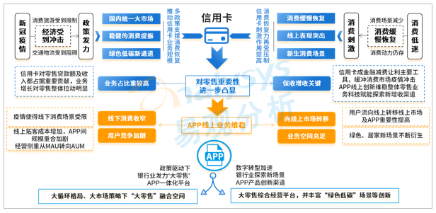 后疫情時(shí)代信用卡對(duì)零售業(yè)務(wù)重要性進(jìn)一步凸顯,APP是經(jīng)營(yíng)重要抓手。從前面數(shù)據(jù)分析可見(jiàn)信用卡對(duì)零售業(yè)務(wù)的重要貢獻(xiàn),國(guó)家推進(jìn)大統(tǒng)一市場(chǎng)建設(shè),對(duì)零售業(yè)務(wù)市場(chǎng)帶來(lái)新機(jī)遇。但在疫情反復(fù)及防控常態(tài)化背景下,線下消費(fèi)場(chǎng)景受阻,人們的消費(fèi)習(xí)慣進(jìn)一步向線上轉(zhuǎn)移,線上消費(fèi)行為模式進(jìn)一步穩(wěn)固,而信用卡承載提振消費(fèi)的重要使命,通過(guò)APP平臺(tái)為信用卡業(yè)務(wù)探索大零售經(jīng)營(yíng)成為銀行機(jī)構(gòu)破局重要方向,以APP平臺(tái)為核心,探索場(chǎng)景化經(jīng)營(yíng),打造場(chǎng)景和服務(wù)閉環(huán)。圖2-3:銀行基于信用卡+APP打造“大零售”經(jīng)營(yíng)體系