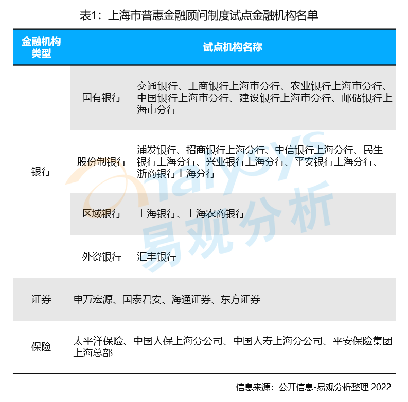 在顧問庫的首批試點(diǎn)金融機(jī)構(gòu)名單中,共包括16家商業(yè)銀行、4家證券公司、4家保險(xiǎn)公司,基本覆蓋了上海市主要的金融機(jī)構(gòu),服務(wù)內(nèi)容方面主要包括政策咨詢、融資規(guī)劃、上市輔導(dǎo)、風(fēng)險(xiǎn)管理咨詢等,能夠基本滿足中小微企業(yè)不同發(fā)展階段的服務(wù)需求。其中匯豐銀行作為唯一一家外資銀行進(jìn)入名單中,體現(xiàn)了地方政府機(jī)構(gòu)在開放合作方面表現(xiàn)的積極意愿。