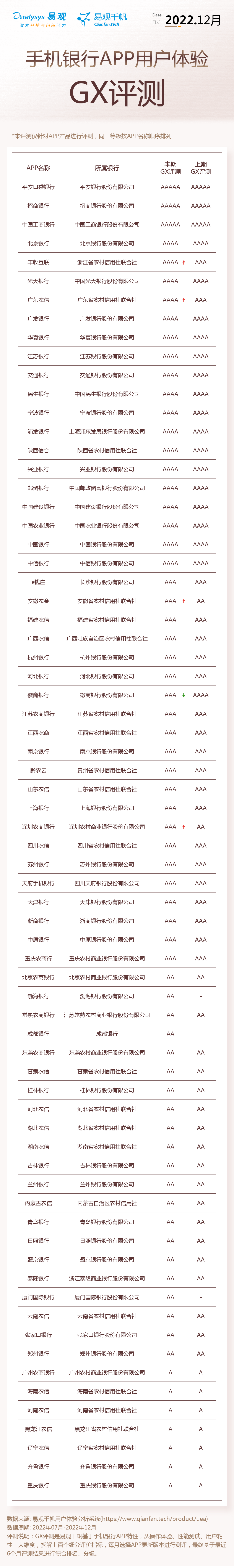 2022年12月入圍用戶體驗評測的手機(jī)銀行APP增加至70個。12月共新增3個手機(jī)銀行APP,分別為渤海銀行、成都銀行、廈門國際銀行,首次評測結(jié)果均為AA級;其他67個手機(jī)銀行APP評測結(jié)果由用戶體驗中心結(jié)合易觀千帆持續(xù)追蹤近半年用戶體驗數(shù)據(jù)綜合評測得出。