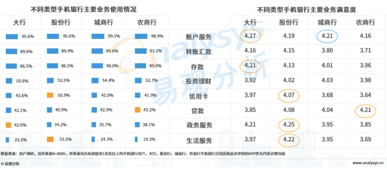 • 賬戶服務(wù)、轉(zhuǎn)賬業(yè)務(wù)使用率、滿意度雙高,非金融服務(wù)使用率較低