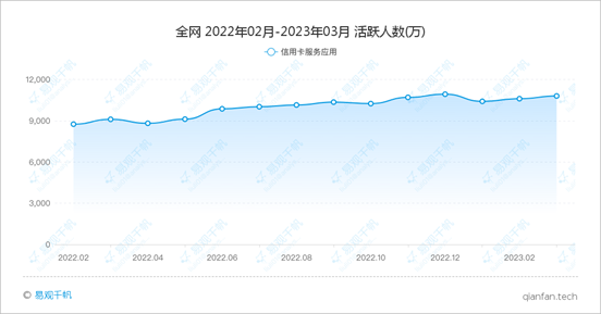 易觀千帆數(shù)據(jù)顯示,2023年2月信用卡服務(wù)應(yīng)用活躍人數(shù)10800.71萬(wàn),環(huán)比增長(zhǎng)1.87%,同比增長(zhǎng)18.64%。