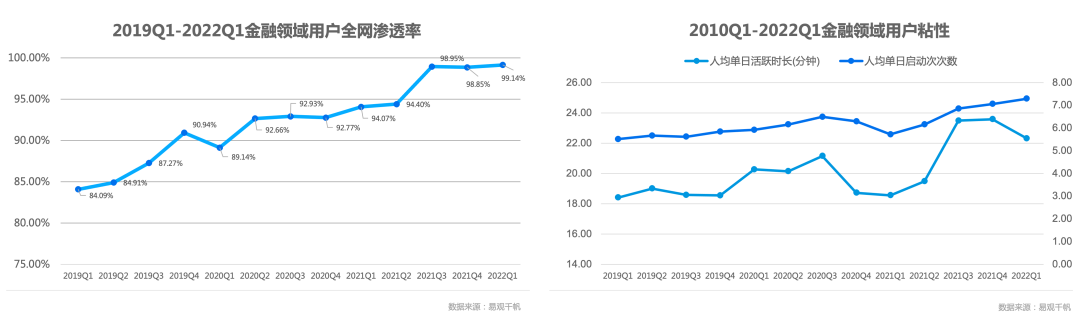 加之當前金融機構已進入渠道為王的時代,通過網(wǎng)點、移動終端以及合作場景等多渠道全方位觸達和服務用戶成為常態(tài)。易觀千帆數(shù)據(jù)顯示,金融領域基本已經(jīng)全面進入數(shù)字用戶時代,用戶規(guī)模逼近全網(wǎng)100%覆蓋,越來越多的用戶通過線上觸點接受服務,如何構建優(yōu)質(zhì)的線上觸點服務用戶,提高用戶體驗,是搶奪用戶、留存用戶、轉(zhuǎn)化用戶的重中之重,也是金融機構提升MAU和業(yè)務價值的關鍵所在。