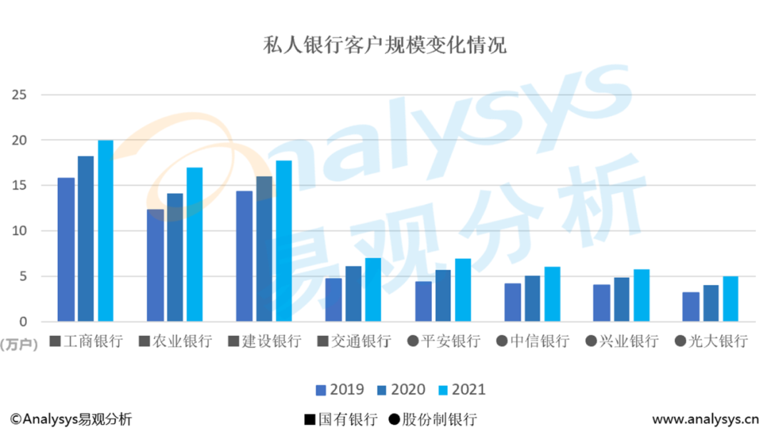近年來,銀行紛紛把零售作為轉(zhuǎn)型戰(zhàn)略重點(diǎn),加快了零售財(cái)富管理業(yè)務(wù)的發(fā)展。而國有銀行在零售財(cái)富客戶規(guī)模上有較強(qiáng)的優(yōu)勢。股份制銀行中,光大、平安和廣發(fā)也在2021年突破了100萬戶。