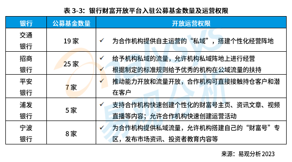 易觀分析選取了5家典型銀行,總結(jié)了銀行開放平臺(tái)公募基金的入駐數(shù)量和對其開放的運(yùn)營權(quán)限。其中,交通銀行是國有行中公募基金公司入駐最多的,達(dá)到19家。而股份制銀行中,招商銀行產(chǎn)品體系最為開放,有25家基金入駐。
