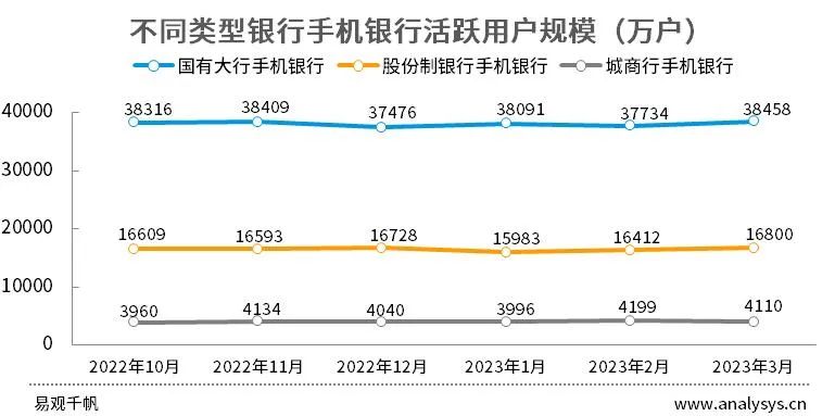 從活躍用戶(hù)規(guī)模來(lái)看,受經(jīng)濟(jì)復(fù)蘇等因素的影響,手機(jī)銀行服務(wù)應(yīng)用活躍用戶(hù)規(guī)模平穩(wěn)上漲,3月整體規(guī)模達(dá)到53289.05萬(wàn)人,對(duì)比歷史數(shù)據(jù),僅低于2022年9月,國(guó)有大行手機(jī)銀行、股份制銀行手機(jī)銀行、城商行手機(jī)銀行活躍用戶(hù)規(guī)模分別為38458萬(wàn)戶(hù)、16800萬(wàn)戶(hù)、4110萬(wàn)戶(hù),環(huán)比增幅分別為1.9%、2.4%、-2.1%。