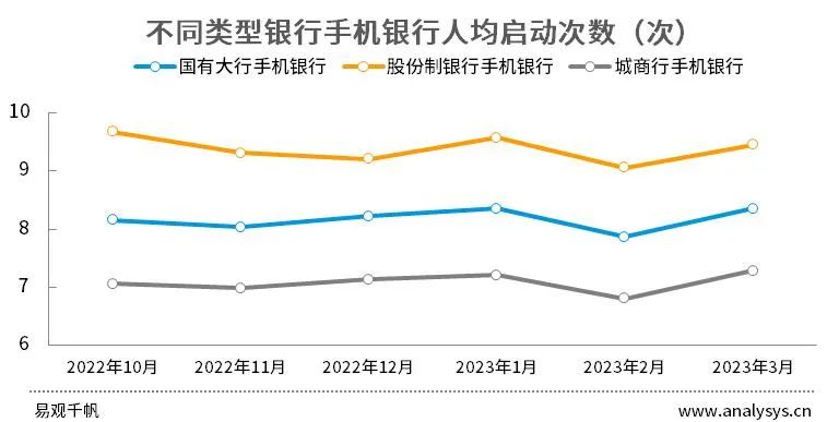 從人均啟動(dòng)次數(shù)來(lái)看,不同類(lèi)型手機(jī)銀行差異較小且較為平穩(wěn),3月,國(guó)有大行手機(jī)銀行、股份制銀行手機(jī)銀行、城商行手機(jī)銀行人均啟動(dòng)次數(shù)分別為9.4次、8.4次、7.3次。
