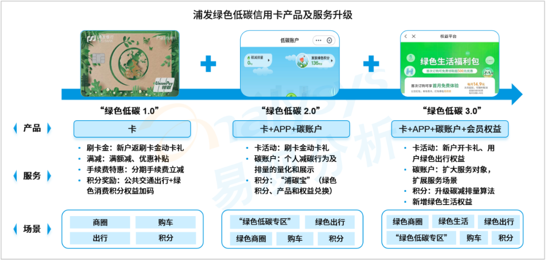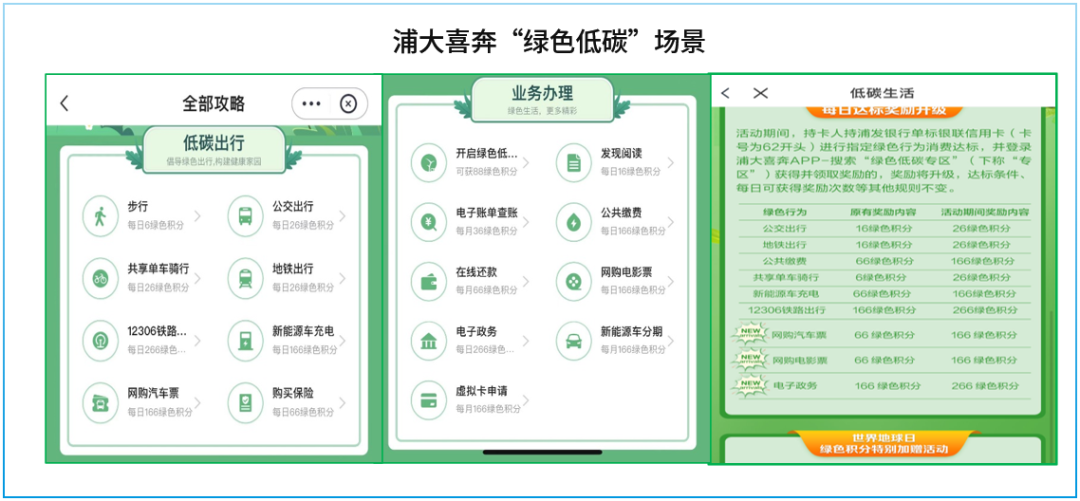浦發(fā)信用卡從1.0到3.0持續(xù)迭代創(chuàng)新綠色服務,引領綠色低碳生活風尚。浦發(fā)銀行信用卡錨定消費者綠色低碳生活與金融服務的融合點,通過低碳卡產(chǎn)品提升用戶綠色消費體驗,引領低碳生活新風尚。在2022年4月推出的綠色低碳1.0主題階段,浦發(fā)信用卡已搭建起綠色服務的基本框架體系,重點從綠色積分、出行、商圈、購車等場景不斷優(yōu)化產(chǎn)品權(quán)益設計,在綠色積分方面,通過綠色低碳行為對應的積分獎勵或綠色主題積分商品兌換,提高用戶參與的積極性;新能源車分期方面,聯(lián)合經(jīng)銷商等開展汽車節(jié)、團購節(jié)等多樣化獲得,為用戶提供指定品牌或車型的分期福利;綠色出行方面,依托銀聯(lián)、微信、支付寶等渠道,打通公共交通、地鐵、共享單車等公共出行場景,享優(yōu)惠乘車福利等;商圈方面,面向日常高頻的消費場景,聯(lián)動優(yōu)質(zhì)商圈商戶,提供消費積分加碼等福利;從用戶實際消費需求出發(fā),以個性化服務形式,激勵及引導用戶培養(yǎng)低碳生活理念和習慣。2.0階段從場景和權(quán)益齊發(fā)力服務綠色生活,場景維度升級主要體現(xiàn)在,浦大喜奔APP上線“綠色低碳專區(qū)”,將1.0綠色權(quán)益體系中單一的主題信用卡場景權(quán)益延展至APP與碳賬戶,構(gòu)建更加立體化的服務場景;權(quán)益維度升級,化單向服務為雙向互動,以綠色低碳專屬經(jīng)營工具“浦碳寶”為主要連接,串起用戶綠色行為與浦發(fā)綠色服務,不僅進一步豐富積分權(quán)益體系,同時滿足用戶精神層面的需求,為用戶帶來“綠色時尚生活”的成就感。今年4月20日,浦發(fā)信用卡再次升級綠色低碳權(quán)益,進入綠色低碳3.0階段,延續(xù)“綠融萬物,共創(chuàng)未來”的初心,從服務對象到服務算法,從服務場景到服務權(quán)益,將2.0階段的服務及權(quán)益進一步深化,實現(xiàn)從上到下、從內(nèi)到外的全面進化。