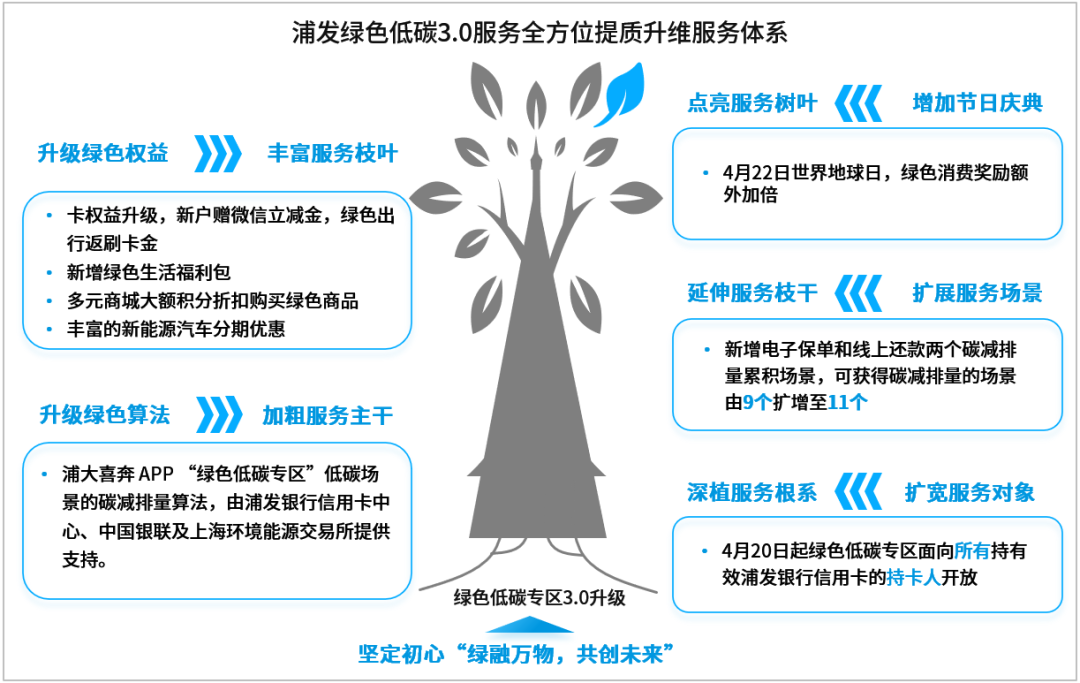 浦發(fā)信用卡從品牌到用戶、從產(chǎn)品到服務、從場景到權(quán)益,層層滲透并傳遞綠色低碳、可持續(xù)發(fā)展理念,不斷創(chuàng)新探索綠色金融的產(chǎn)品及服務模式、服務理念,加速綠色低碳轉(zhuǎn)型。● 浦發(fā)綠色低碳3.0全方位提質(zhì),綠色低碳服務體系更加枝繁葉茂浦發(fā)信用卡綠色低碳3.0,一方面是豐富“浦發(fā)綠創(chuàng)”品牌內(nèi)涵,從綠色金融服務到綠色低碳生活理念的引領;另一方面加大綠色金融創(chuàng)新和服務力度,在以卡服務核心的1.0和以“卡+APP”為主的2.0基礎上繼續(xù)升級,深根廣系,加粗主干、延伸枝干、豐富枝葉,全面升維經(jīng)營體系,助力綠色低碳服務體系更加枝繁葉茂。