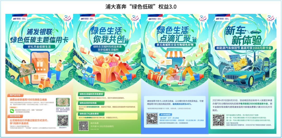 權(quán)益更加豐厚,豐富服務枝葉,升級浦發(fā)綠色服務質(zhì)量。一是升級卡權(quán)益,針對新戶的權(quán)益,首次辦理浦發(fā)銀聯(lián)綠色低碳主題信用卡,消費達標可享最高198元微信立減金,分3個月領取,每月最多領取6.6*10張;面向出行服務的權(quán)益,持卡用戶公交地鐵出行并通過指定方式支付,可享1元刷卡金返還,每月限優(yōu)惠10筆。二是升級綠色生活權(quán)益,浦發(fā)信用卡用戶可訂購首月免費,次月14.9元/月自動續(xù)約的綠色生活權(quán)益禮包,其中包含每月免費領取的權(quán)益價值超200元的禮包,綠色會員折扣充值以及綠色首訂禮遇免費領三大權(quán)益,具體涵蓋了公交紅包、共享單車騎行卡、打車紅包券、薄荷健康月卡折扣、每日瑜伽月卡折扣、知乎鹽選折扣、17K小說會員卡、便攜餐具等多品類優(yōu)惠權(quán)益。三是升級多元商城權(quán)益,多款綠色低碳環(huán)保產(chǎn)品上架,持卡人在多元商城指定綠色專區(qū)分期支付購買商品,可享受積分最高抵扣46%的抵扣優(yōu)惠。四是升級新能源汽車購買權(quán)益,在活動期間,活動地區(qū)達標持卡人按提交申請辦理汽車分期的時間先后順序每月取前2000名贈送刷卡金,在有效期內(nèi)使用浦發(fā)信用卡新增消費累計滿3000元可抵扣。從專屬綠色信用卡權(quán)益到綠色生活會員禮包,再到商品購物消費以及新能源汽車購買,浦發(fā)綠色服務相關權(quán)益更加豐富,滿足用戶更多元需求。