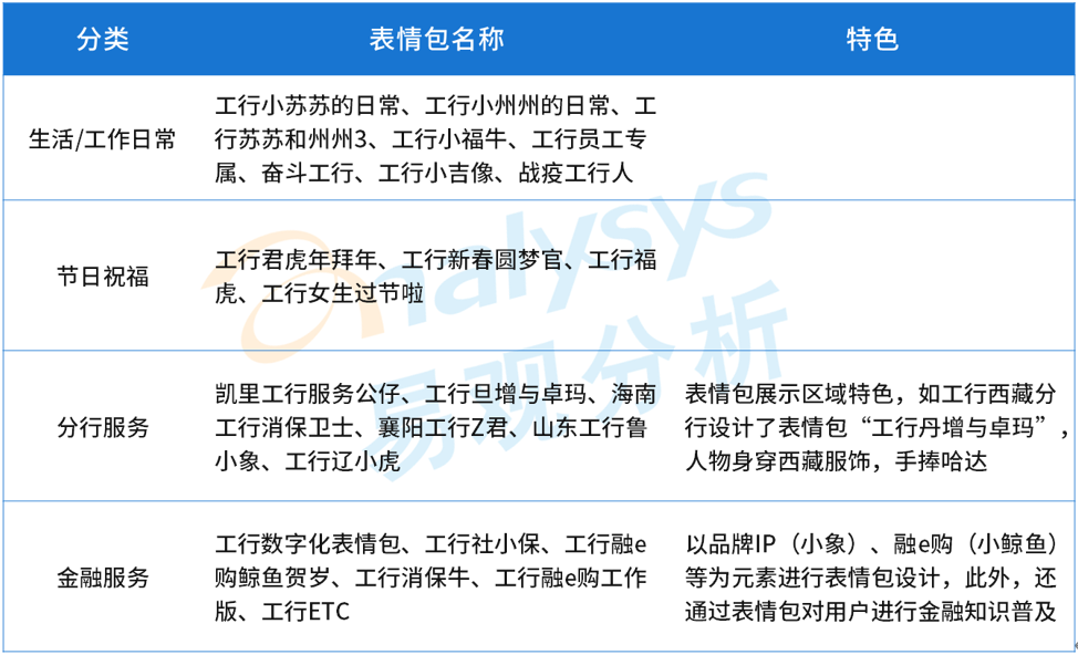 作為國有大行代表,截止到5月底,工商銀行共發(fā)布了25個(gè)表情包。其中,包括生活/工作日常系列、節(jié)日祝福系列、分行服務(wù)系列、金融服務(wù)系列。其中,分行服務(wù)方面,如工行西藏分行設(shè)計(jì)了表情包“工行丹增與卓瑪”,人物丹增和卓瑪身穿西藏傳統(tǒng)服飾,手捧哈達(dá),表情包展示了西藏地域特色;金融服務(wù)方面,如以小象、小鯨魚為形象元素進(jìn)行表情包設(shè)計(jì)??傮w來說,工商銀行發(fā)布的表情包形式多樣,且具有趣味性,并通過卡通元素對(duì)金融知識(shí)進(jìn)行普及傳遞。