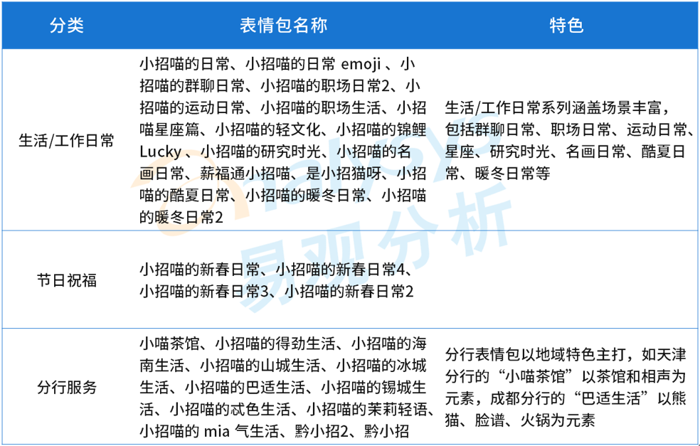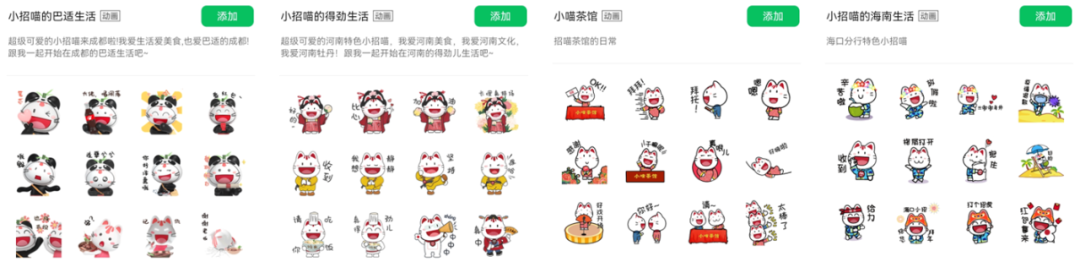 作為股份制銀行代表,截止到5月底,招商銀行共發(fā)布了32個(gè)表情包。其中,包括16款生活/工作日常系列表情包,涵蓋群聊日常、職場(chǎng)日常、運(yùn)動(dòng)日常、星座、研究時(shí)光、名畫日常、酷夏日常、暖冬日常等;此外,招商銀行各分行也推出具有分行特色的表情包,如天津分行的“小喵茶館”以茶館和相聲為元素,成都分行的“巴適生活”以熊貓、臉譜、火鍋為元素,突出地域文化特色??傮w來說,招商銀行發(fā)布的表情包應(yīng)用場(chǎng)景豐富,趣味性強(qiáng),并將品牌IP“小招喵”形象融入到各系列表情包中,讓招行的品牌影響力發(fā)揮到最大化。