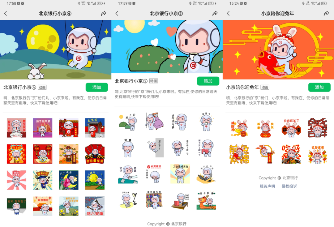 形象更多元化。目前,北京銀行除“小京”系列外,還以“京京”和“螢螢”兩只螢火蟲為形象創(chuàng)造兩款表情包。多元化的表情包可以更直觀、更豐富地表達(dá)情感,讓雙方產(chǎn)生情感共鳴,拉近彼此的距離,使溝通更加順暢,從而提高表達(dá)效率。