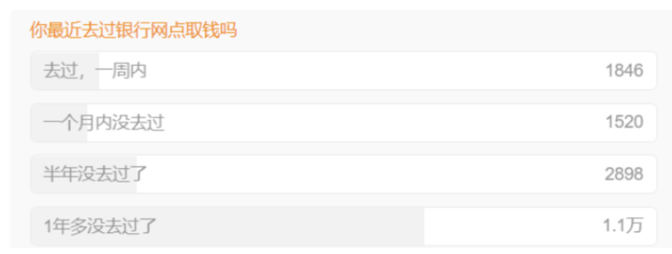 在#你最近去過銀行網(wǎng)點(diǎn)取錢嗎#的一則微博調(diào)查中,有1.7萬人參與,1.1萬人投票“1年多沒去過了”,一周內(nèi)去過的只有不到2千人。