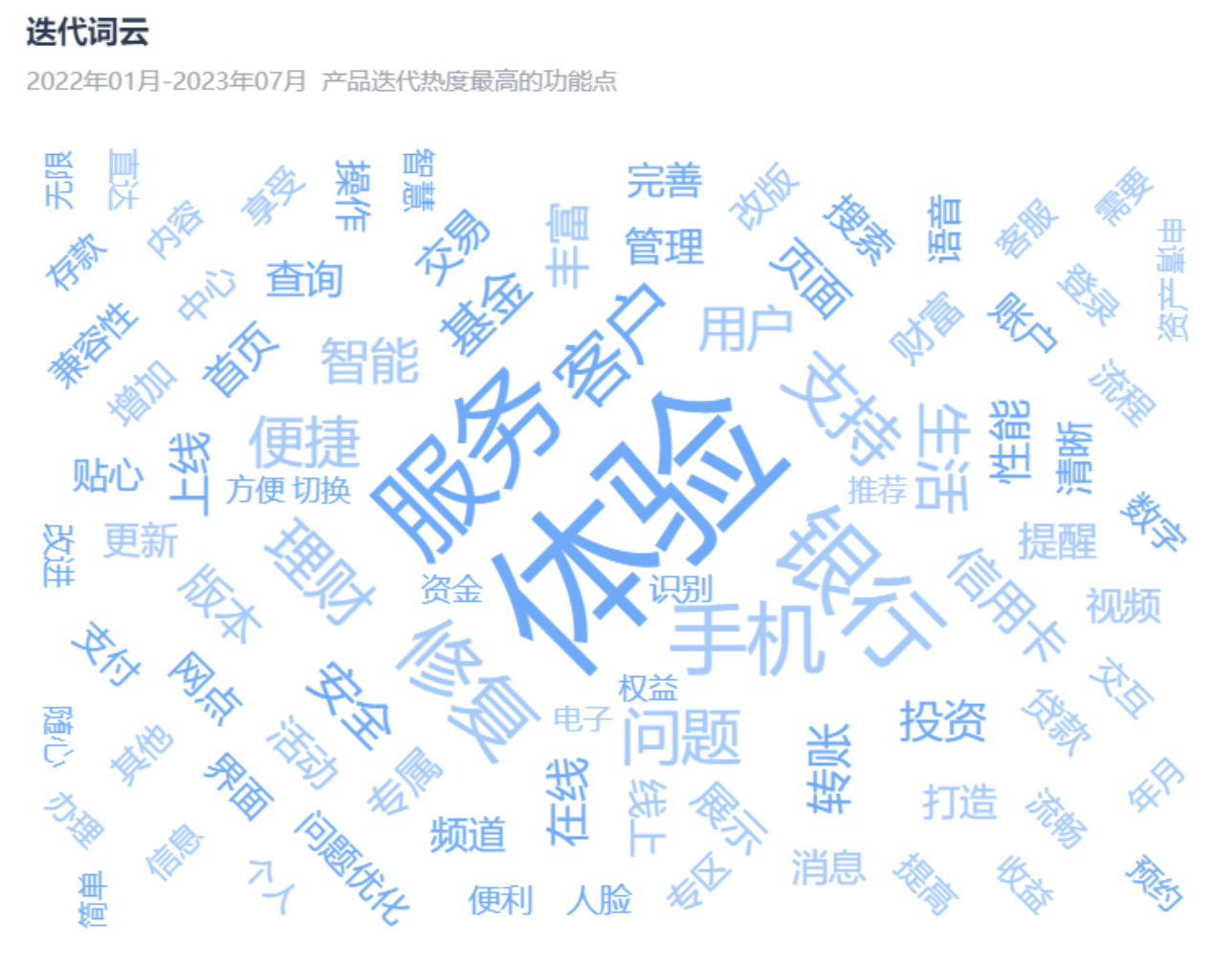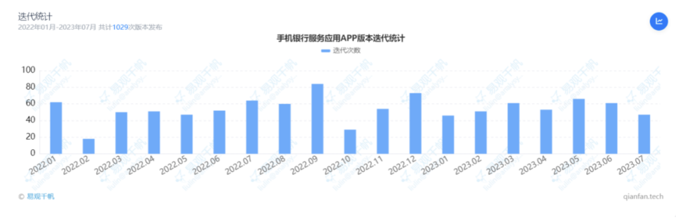 截止2023年7月,手機(jī)銀行服務(wù)應(yīng)用APP版本迭代共計(jì)1029次,版本迭代關(guān)鍵詞聚焦服務(wù)、體驗(yàn)、客戶等。