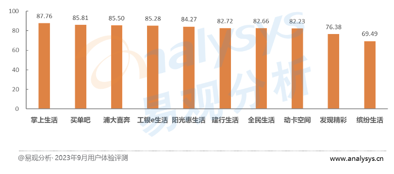 信用卡APP的價(jià)值內(nèi)核在于連接、運(yùn)營信用卡用戶,如何清晰識別用戶需求,并以平臺運(yùn)營和商戶資源為其提供豐富的生活消費(fèi)服務(wù),是信用卡APP建設(shè)、運(yùn)營的關(guān)鍵命題。價(jià)值度指標(biāo)主要衡量頁面布局、業(yè)務(wù)邏輯、業(yè)務(wù)流程等方面的用戶體驗(yàn)情況,因而成為信用卡APP用戶體驗(yàn)評價(jià)的核心要素。從價(jià)值度評分結(jié)果來看,掌上生活得分最高、買單吧次之、工銀e生活位列第三。掌上生活以深耕“兩票”場景為基礎(chǔ),優(yōu)化內(nèi)容生態(tài)、延伸汽車、商城等生活服務(wù),并將生活消費(fèi)與金融場景深度串聯(lián),不斷優(yōu)化APP使用價(jià)值度。工銀e生活近年來持續(xù)圍繞停車洗車、餐飲、購車、家裝、旅游等居民消費(fèi)場景,聚焦體驗(yàn)最優(yōu)、支付便捷、優(yōu)惠打通等方面,創(chuàng)新品質(zhì)外賣、商超便利等八大生態(tài)領(lǐng)域建設(shè),打造用戶和商戶、供給與需求、線上及線下高效對接、相互帶動的消費(fèi)服務(wù)平臺,完善消費(fèi)新業(yè)態(tài)、新模式、新場景,滿足用戶多元化需求,提升用戶對“美好生活觸手可及”的品牌認(rèn)知,促使用戶對價(jià)值度認(rèn)可提升。建行生活依托國有銀行豐富資源,功能和場景均較為完善,同時(shí)增加了零錢理財(cái)、會員有禮等亮點(diǎn)布局,但仍存在色彩運(yùn)用過于豐富、頁簽合理性有待提升、個(gè)別入口不易查找等問題,這也是價(jià)值度排名相對靠后的APP普遍存在的問題。